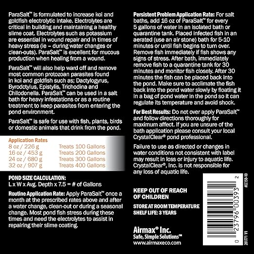 • Improves Poor Parasite Conditions - ParaSalt will help ward off the most common protozoan parasites found in ponds. Helps prevent common diseases while supporting fish health.