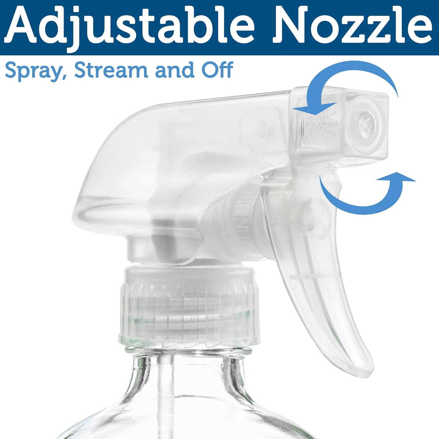 • Large 16 ounce bottle with an easy to pull clear nozzle that can be set to either a fine mist or a strong stream. Includes 2 phenolic caps and 4 3"x3" labels.