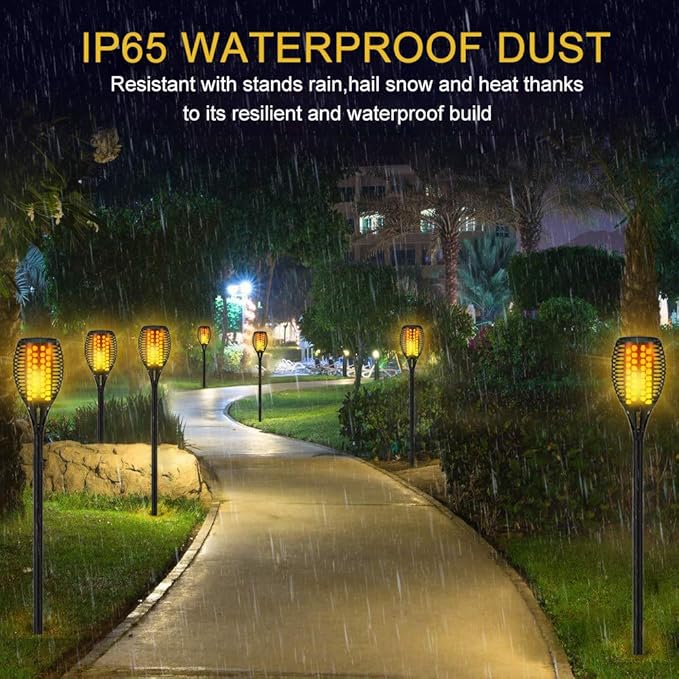 • 🔥AMAZING FLICKERING FLAMES SOLAR LIGHTS : This solar flame torch light is a safe alternative to the real “flames”. 96 LEDs in the light cast a safe, soft, mood-enhancing glow,provide a perfect campfire atmosphere for your patio, backyard, deck decor ,garden,party, BBQ and camping.