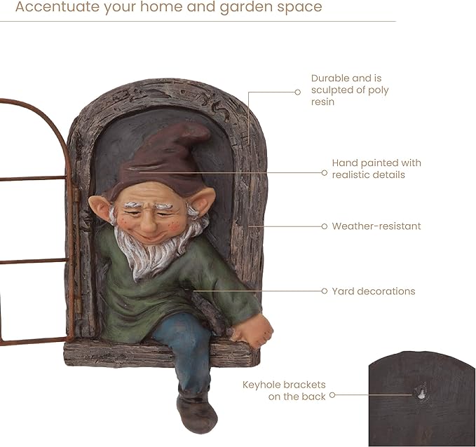 • Weather Resistant Decor: Elf out the Door Tree Hugger is durable and is sculpted of poly resin that can resist outdoor weather conditions. It is hand painted with realistic details and texture making it a great piece of yard decoration