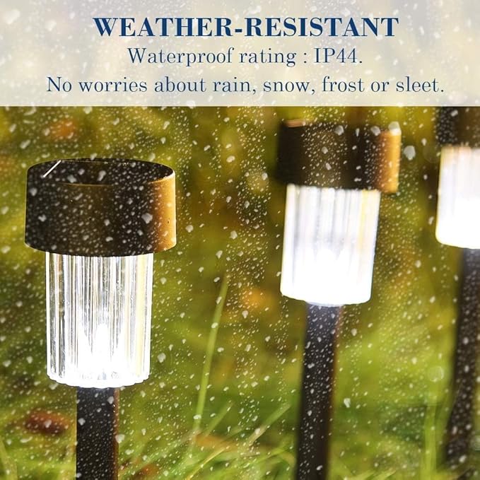 • IP44 WATERPROOF: No worry about about rain and snow weather, there solar lights are perfect decor for your outdoor walkway, pathway, driveway and so on