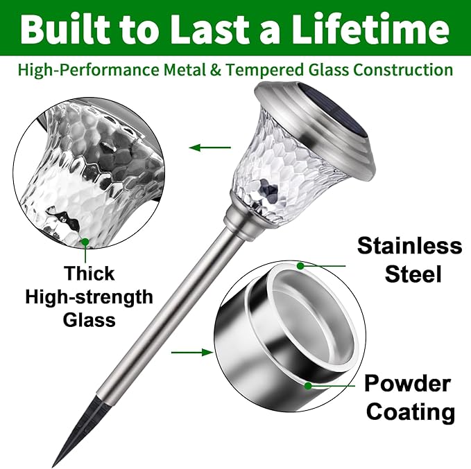 • SIZE & PREMIUM MATERIAL: 8 pack solar pathway lights measures 16.54" in height x 4.72" in diameter. Colored solar Pathway Light with auto sensor made of stainless steel with watertight diamond glass light shade that enables you to use this bright solar light durably. And glass lens is not prone to fogging or condensation buildup.Good glass lens resistant to cracking or breaking.Premium metal and glass of this solar pathway light outdoor for garden, lawn and backyard is much better than others.