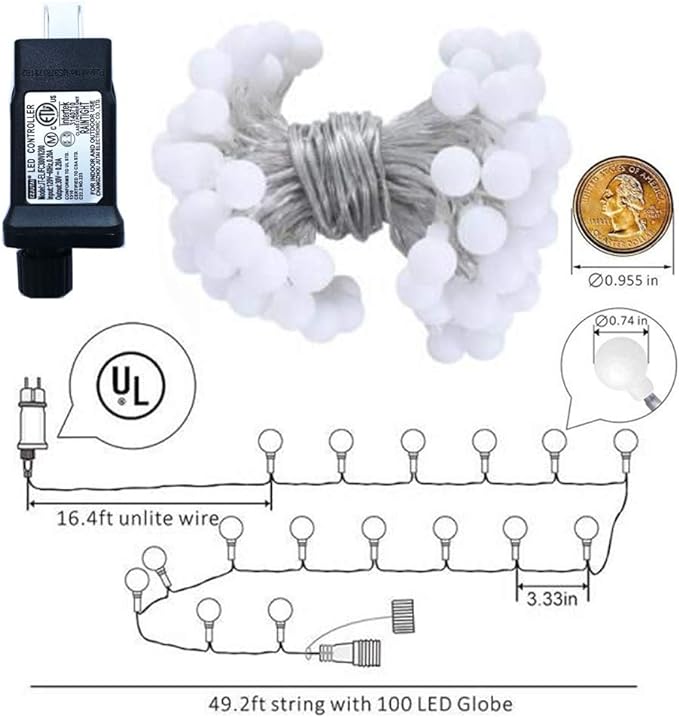 • Led Globe String Ligths: Plug in 100 LED 49ft(33ft String Lights,16ft Lead Wire) Warm White Globe String Lights-UL Listd, more durable