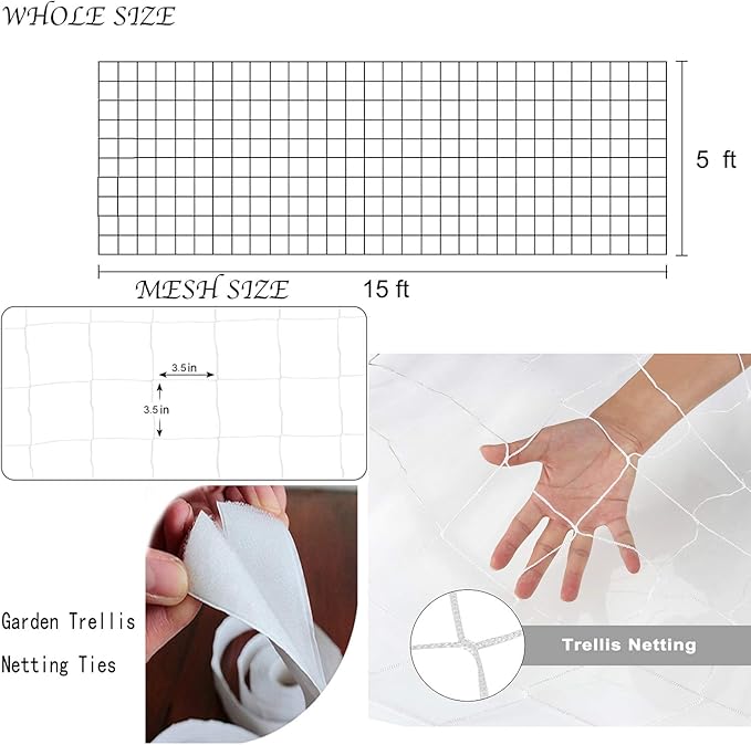 • 5.【EASY TO INSTALL】plant trellis net,Simply wrap and tie the netting around any stable structure or support, For ease of use, Garden Trellis Netting ties are provided,100% SATISFACTION GUARANTEE,Covered by our risk-free Refund or Replacement Guarantee,Dimensions:3.5 inch Mesh, overall size 5ft x 15ft.1pack