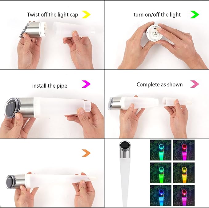 • ► 【Unique Lighting】-- 6 pack Decorative solar garden path lights have upgraded lighting effect design, 4 LED bulbs (2 white lights and 2 rgb lights) with 2 modes, white light and RGB color changing light, more brighter, more beautiful, light up your garden.