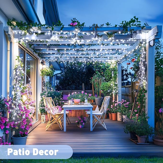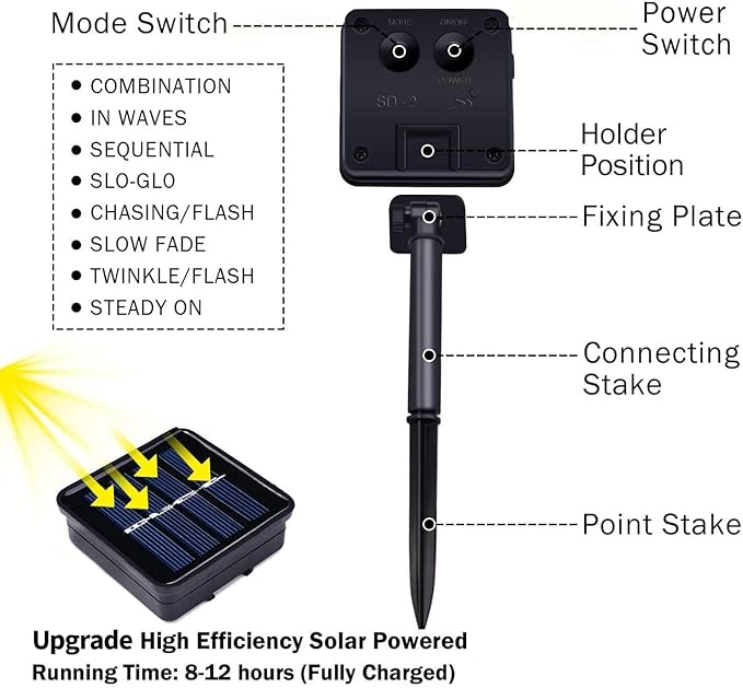 • 【8 Lighting Modes White Solar Lights】 8 modes which include Waves, Combination, Fading, Fireflies, Chasing, Twinkle, Fading slowly, and Steady-on. The solar outdoor Christmas lights will intelligently remember your last choice lighting mode, no need to reset every time.