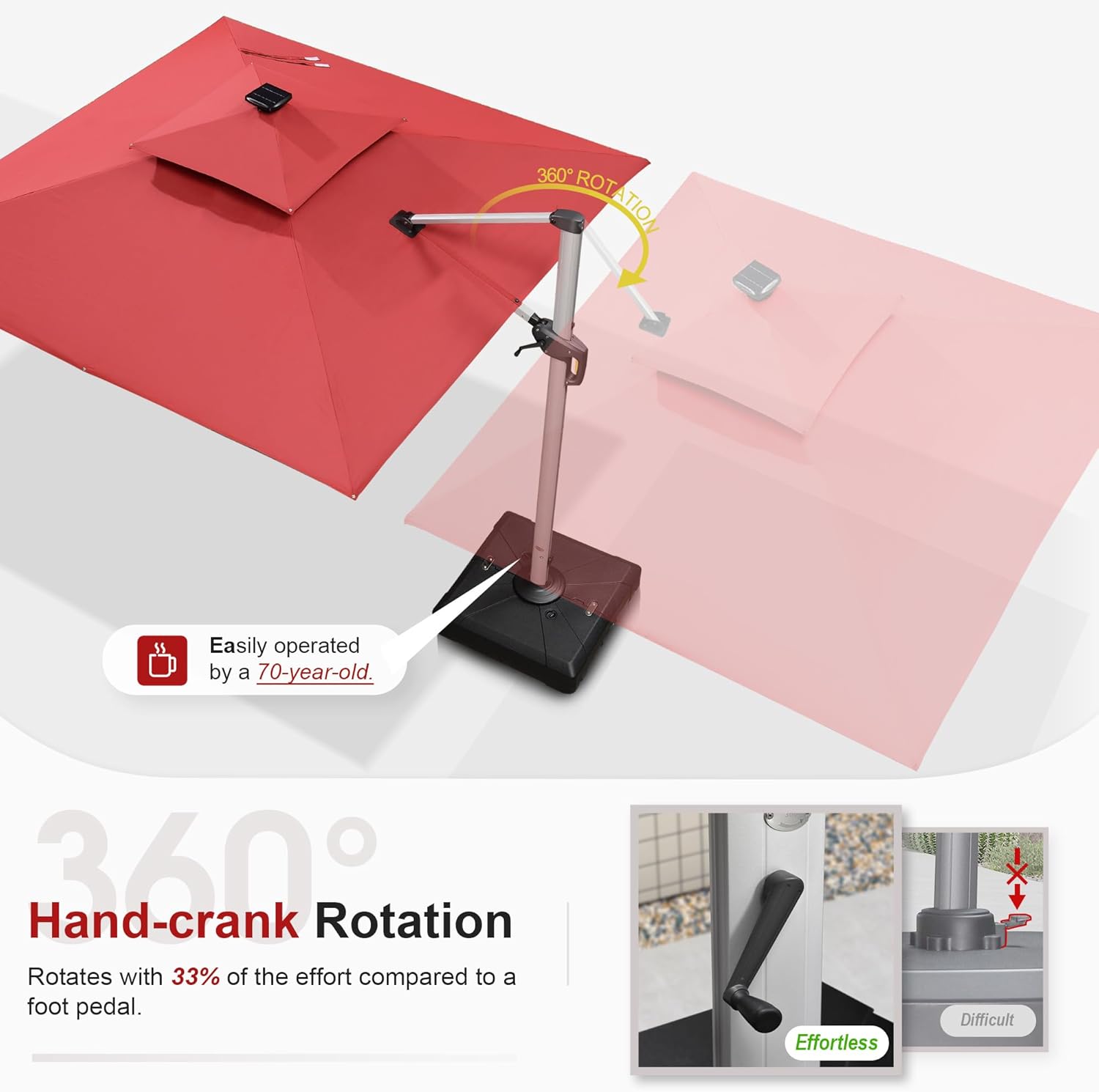 • Multi-function adjustment: Unique handle design and crank system, 6 height and angle to choose, 360 degree rotation for easier shading area control