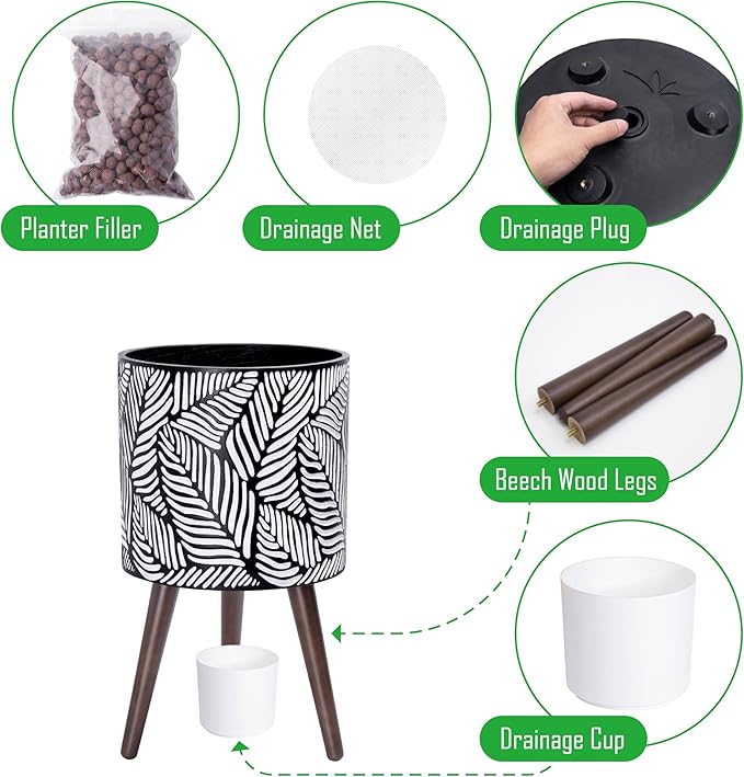 • What’s included: planter pot with drainage hole, drainage plug, set of stand – 3 solid wooden legs.