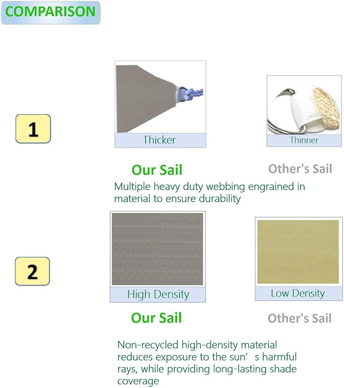 • High Quality Guarantee: Our shade sail made from non-recycled HDPE (high-density polyethylene) 180gsm, industrial cross-weaving for superior support & long-lasting durability. Ready to hoist upon sturdy connections at all four corners. Easy to install, very thick & durably-enforced webbing. Our shade sail includes 304 Stainless Steel D-rings stitched seamlessly into its corners & comes with nylon ropes for convenience, length & width are measured from D-ring to D-ring