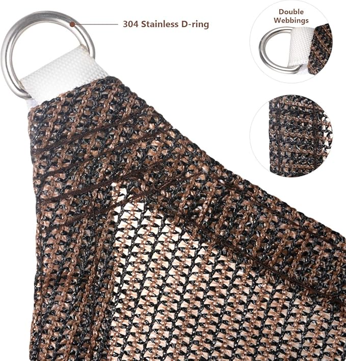 • High Quality Guarantee: Our shade sail made from non-recycled HDPE (high-density polyethylene) 180gsm, industrial cross-weaving for superior support & long-lasting durability. Ready to hoist upon sturdy connections at all four corners. Easy to install, very thick & durably-enforced webbing. Our shade sail includes 304 Stainless Steel D-rings stitched seamlessly into its corners & comes with nylon ropes for convenience, length & width are measured from D-ring to D-ring