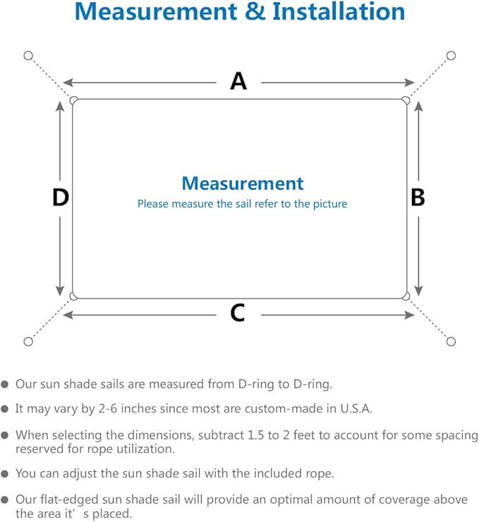 • High Quality Guarantee: Our shade sail made from non-recycled HDPE (high-density polyethylene) 180gsm, industrial cross-weaving for superior support & long-lasting durability. Ready to hoist upon sturdy connections at all four corners. Easy to install, very thick & durably-enforced webbing. Our shade sail includes 304 Stainless Steel D-rings stitched seamlessly into its corners & comes with nylon ropes for convenience, length & width are measured from D-ring to D-ring