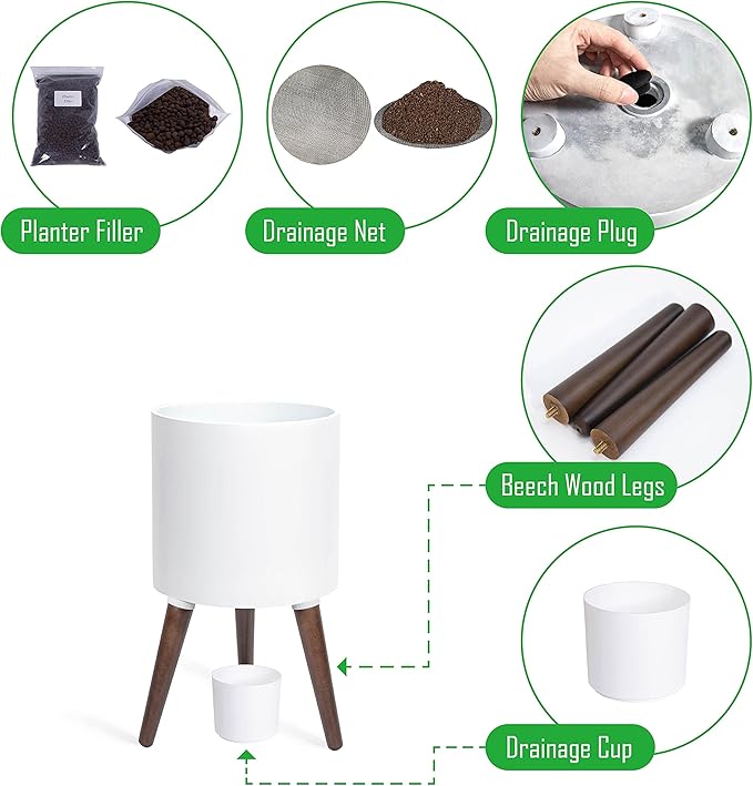 • What’s included: planter pot with drainage hole, set of stand – 3 solid wooden legs.