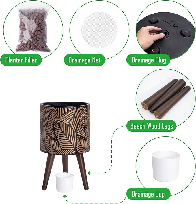 • What’s included: planter pot with drainage hole, drainage plug, set of stand – 3 solid wooden legs.