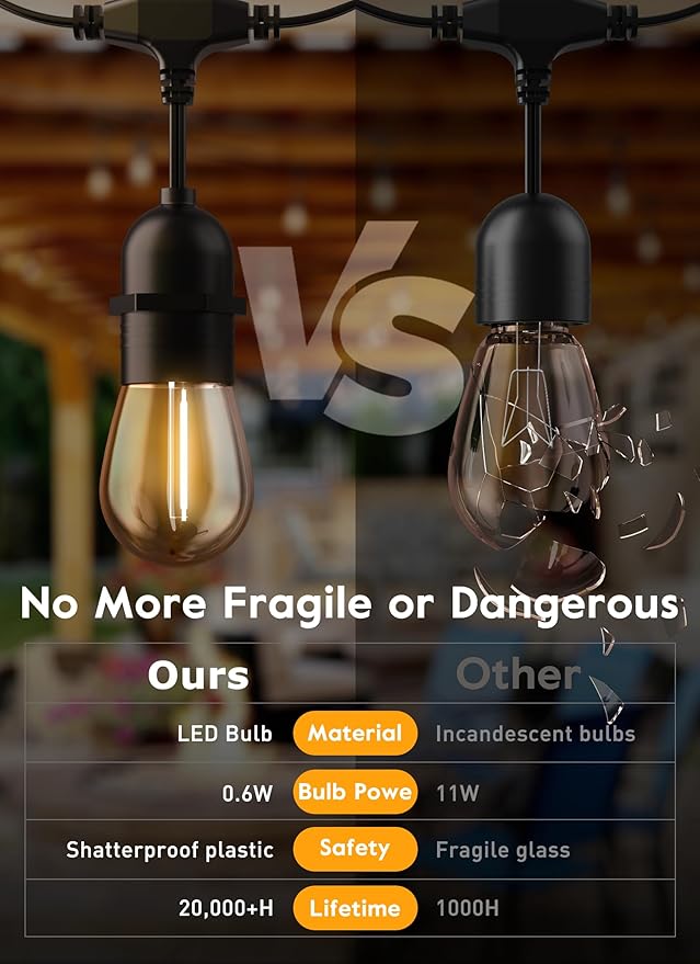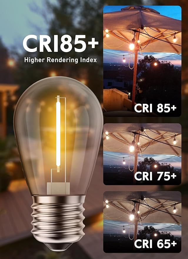 • Energy saving string lights replacement bulbs: S14 LED bulbs have a candelabra base that fits into either an E26 or E27 screw base. Each piece 120V 1W equivalent to 11 watt traditional incandescent bulbs. Waterproof edison led bulbs for indoor and outdoor use