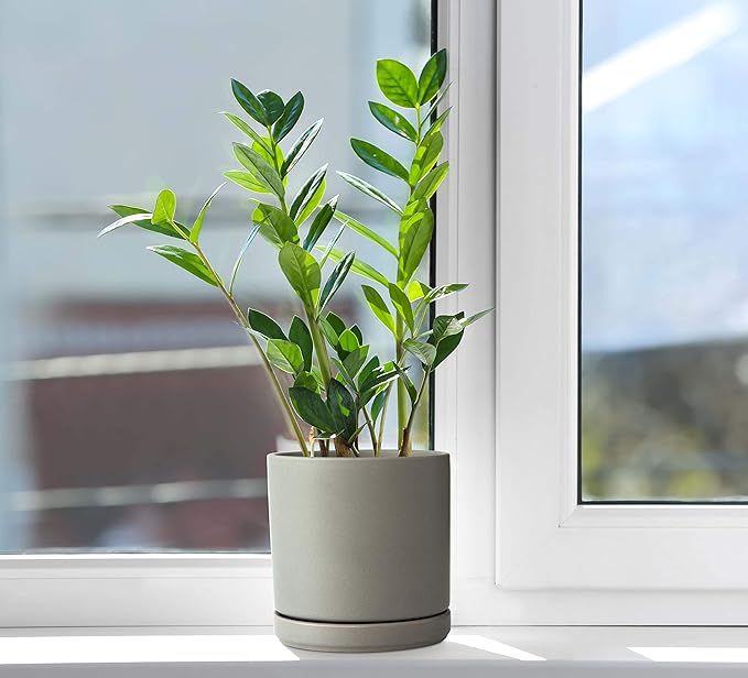 D'vine Dev 6 Inch Ceramic Planter Pot with Drainage Hole and Saucer, Indoor Cylinder Round Flower Pot, Grey, 94-O-C-3