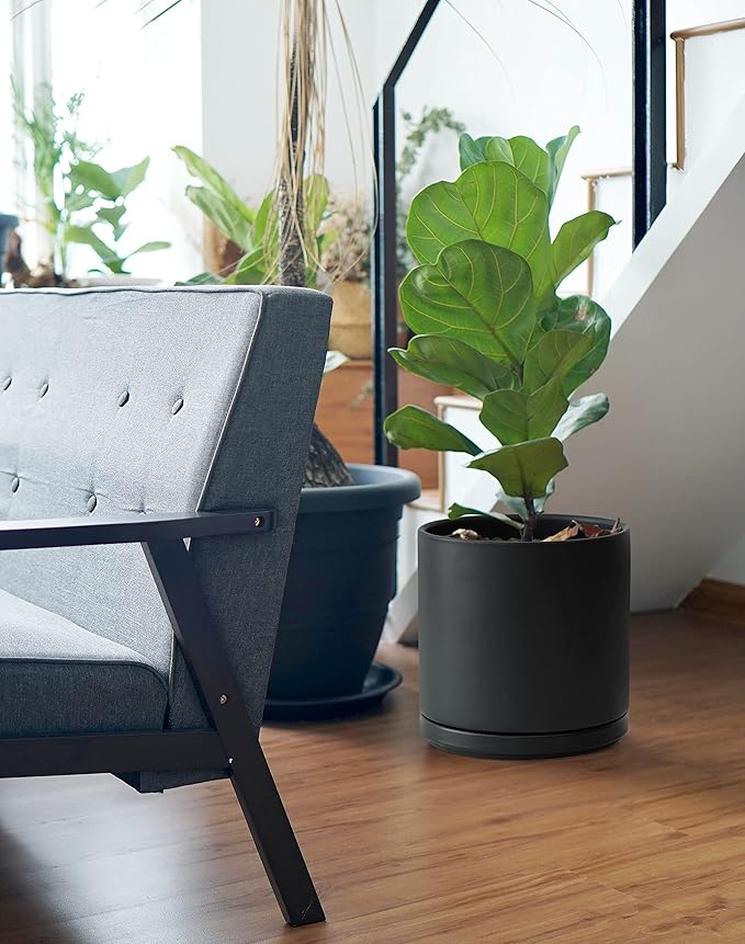 D'vine Dev 10 Inch Ceramic Planter Pot with Drainage Hole and Saucer, Indoor Cylinder Round Planter Pot, Black, 94-O-E-2