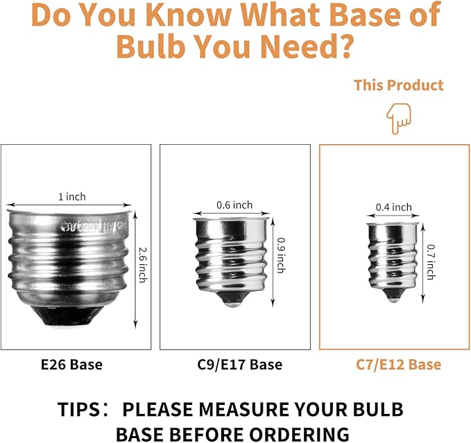 • Fits sockets: E12 or C7 candelabra nickel base which prevent corrosion. Each piece 120V 5W