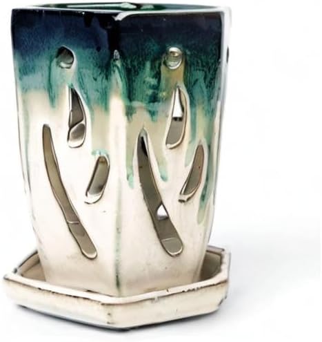 rePotme 4 x 6 inch Ceramic Orchid Pot (Evergreen Emerald Over Cream) - Hexagon Orchid Pot with Holes