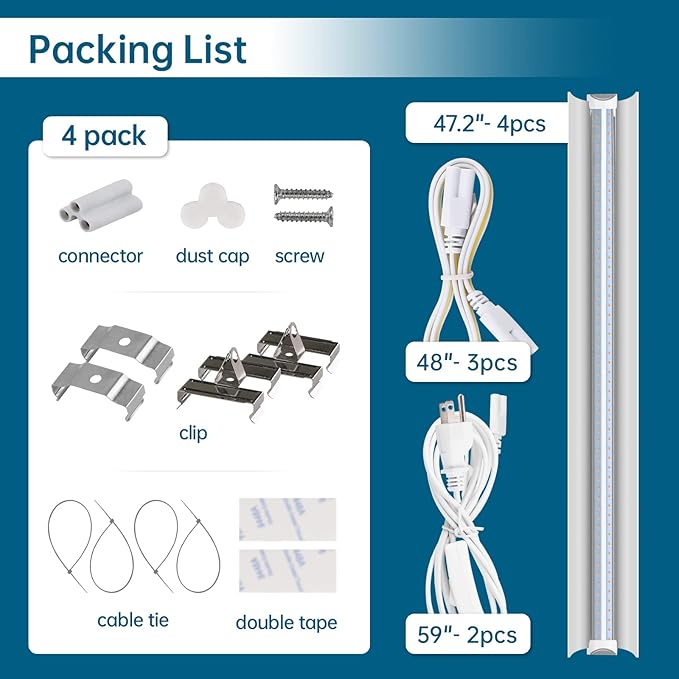 • What You Get: 4 x Barrina LED Grow lights, 2 x Power cords with ON/OFF switch, 3 x Connecting Cords(48''), 4 x Small Connectors, 16x Installation Clips, 8 x Double-sided tape, 16 x cable ties