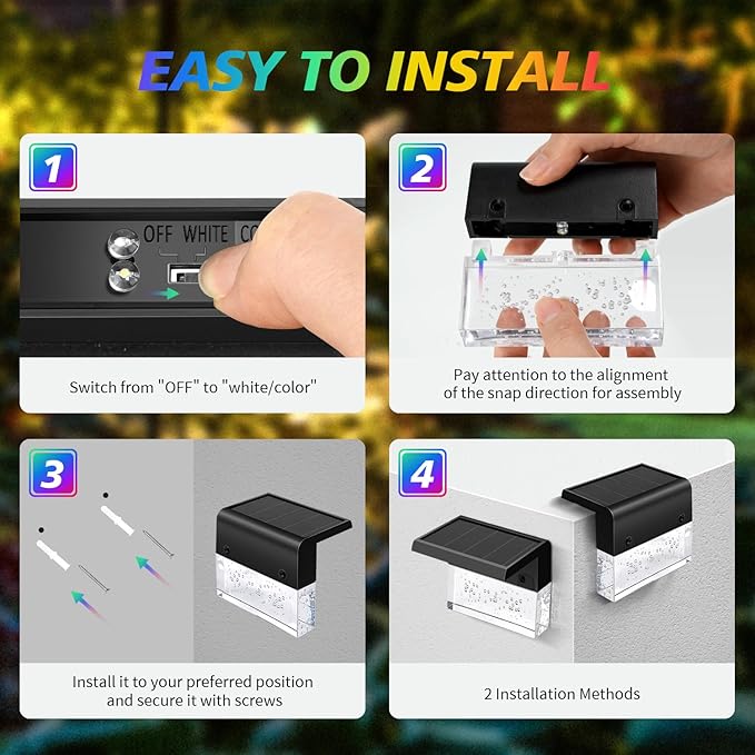 • 【EASY INSTALLATION】Solar step lights for outside is easy to install. Only two screws or double-sided tape (not included) are needed to fix the solar garden light on any flat surface, such as fence, step edges, stair railings, etc. Tip: Before using for the first time, please select the desired light mode "warm yellow/color" and charge the solar lights for fence by installing it in direct sunlight for 1 day.