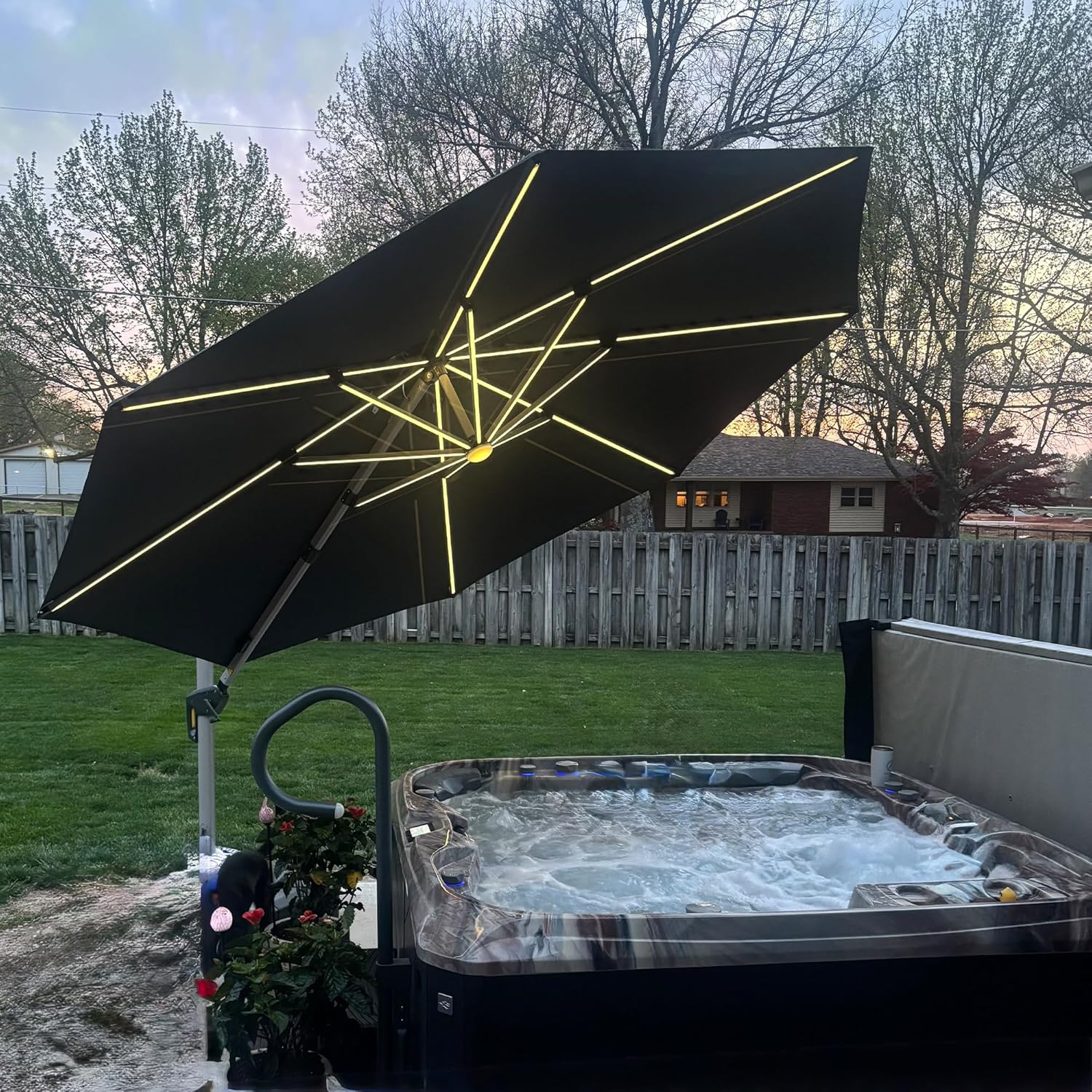 PURPLE LEAF 12ft Solar powered LED Patio Umbrella Outdoor Round Umbrella Large Cantilever Umbrellas with LED lights Windproof Offset Umbrellas Heavy Duty Sun Umbrella for Garden Deck Pool Patio, Grey