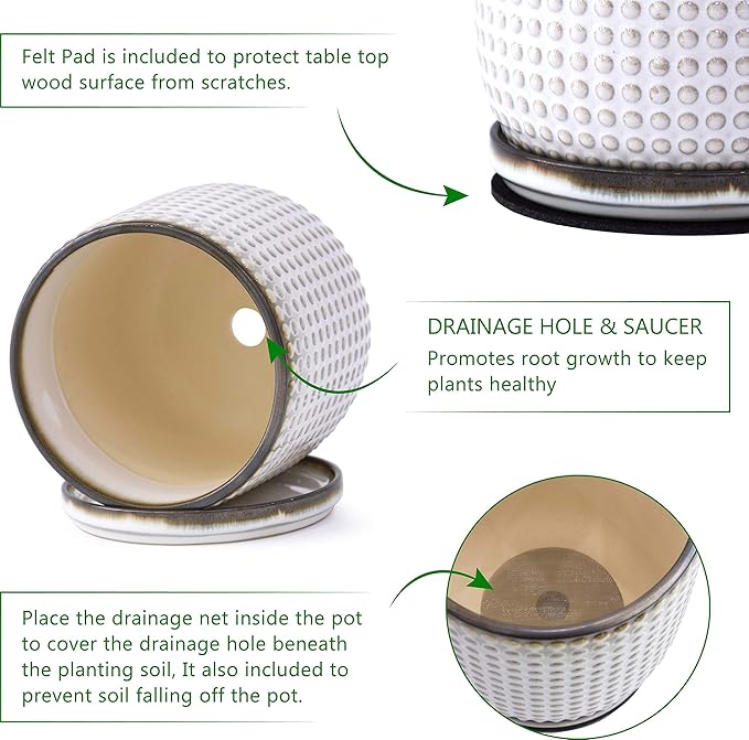 • >> Drainage Net and Pad - A stainless-steel drainage mesh net is also included to prevent soil from falling off the pot. Another protective pad is included to protect tabletop wood surface from scratches.