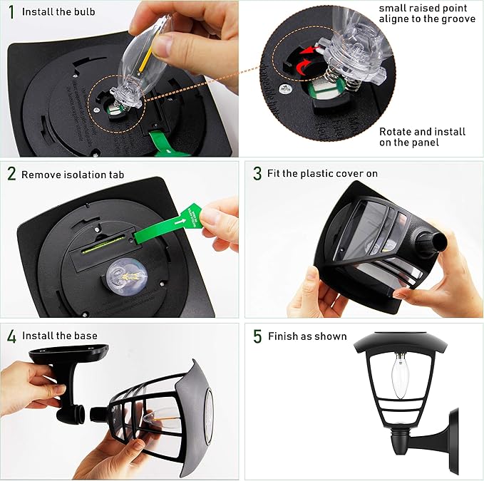 • Outdoor solar powered lights--powered by solar, charged in full and direct sunlight for 6-8 hours, the lights automatically turn the lights on at dusk and off at dawn. There is an INSULATION TRIP on the light cover, before charging need to unscrew the light cover then REMOVE INSULATION TRIP.