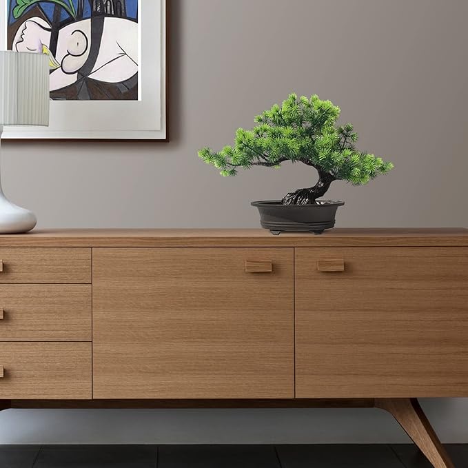 • Artificial plants & greenery fake bonsai is made of plastic, Size chart details: Height 9.5 inches, Width 12 inches (pots height 2",width 6.3"). Recommended for decoration on bookshelfs, tables and windowsills