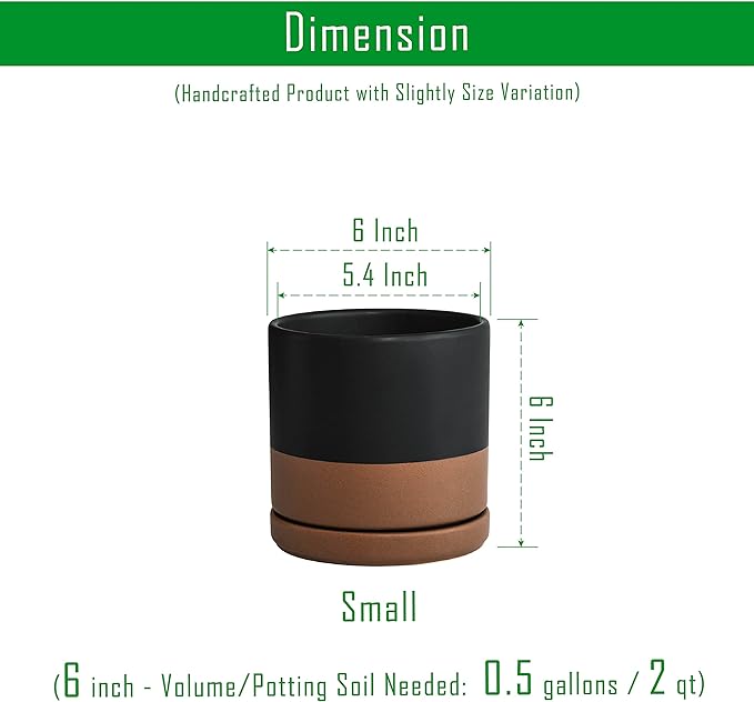 • Small 6 Inch Planter Pot: 6" Diameter x 6" H, black & speckled tan/brown color. Potting Soil Needed: 0.5 gallons / 2 qt.