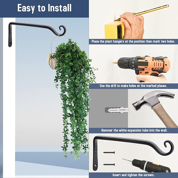 • 【HIGH QUALITY】The plant hook is 4.5 inches in height and 10 inches from the wall, screw length is 1.6 inches, the screws are included. These hanging plant hooks are made of high-quality iron and coated with powder,they are rust and corrosion resistant. Premium quality makes them sturdy.
