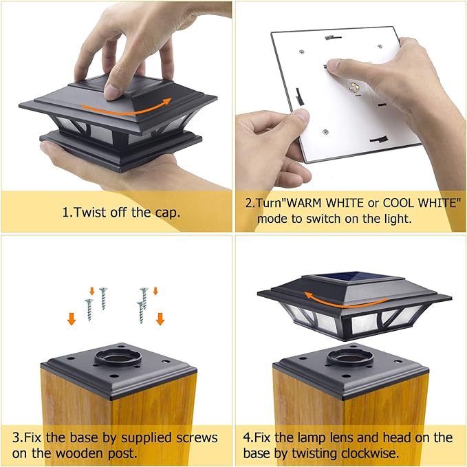 • 【Easy to Use】Install them according to the instructions, fix the base by supplied screws on the wooden post. Solar powered post lights are charged in the daytime for 6-8 hours under the sun, and will turn on for 10-12 hours in the nighttime automatically.