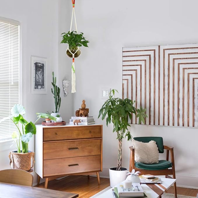 • SAVE SPACE - These 5 colorful macrame hanging plants hanger makes a wonderful gift for house warmings, weddings, and all occasions.Use for living room, garden, kitchen, window, balcony, deck, patio, Porch, hallway, high and low ceiling decoration to save on shelf space and can beautify any indoor / outdoor corner spaces.