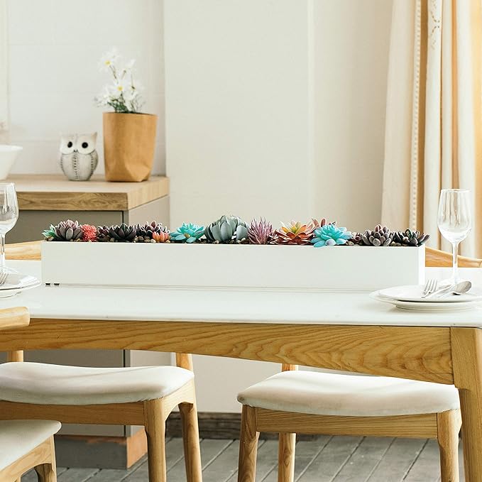 • Modern room decor: Our stylish rectangular planter box makes a decorative statement on its own. It is simple yet elegant. This minimalist design has been powder coated with a pure white easy to clean finish. This finish is resistant to scratches, chips and fading. It is perfect to elevate and blend into any home dĂ©cor! Please note that plants and rocks are not included.