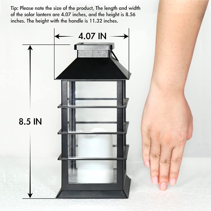 • big surprise on Oct 8-9,2024! the more saving,the more happier-[Cute LED Flickering Flameless Candle] The traditional retro lantern design, flashes like a real candle. The length and width of the solar lantern are 4.07 inches, and the height is 8.56 inches. The height with the handle is 11.32 inches.Tip: Please note the size of the product, you can refer to the picture comparison.