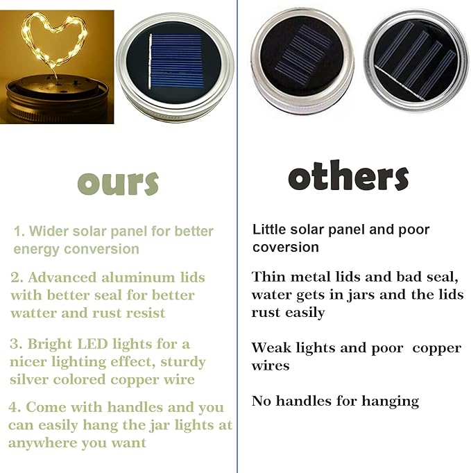 • High Quality & Romantic - Very popular Mason Jar string fairy firefly lights lids. Turn your discarded mason jars into beautiful lights to decorate your surroundings.Just put it on shelves,tables,porches, trees,patios and pergolas.A great gift family and friends who love decorating home