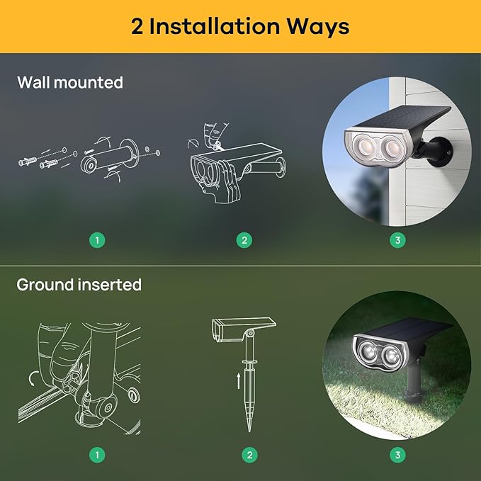 • ☆TWO-WAY MOUNTING- With specially designed ground stake and wall bracket, you can either stick the spotlight into the ground as solar landscape light or fix it on the wall as wall light. Be creative to arrange the position which you want to be. Perfect for patio, porch, deck, pool, yard, garden, garage, driveway, pathway, etc.