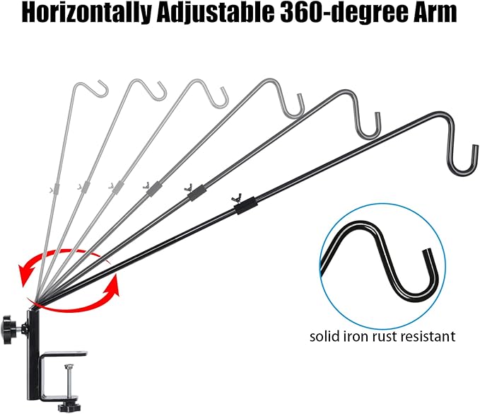 • SIZE:The hook is 31 inch long with 360 Degree Swivel which allows you to adjust angle of the hook. Double Forged-adjustable clamp fits onto to deck railings which can be 0.5inch~3inch wide. Suggested max hanging weight 16 lbs (7.2kg).