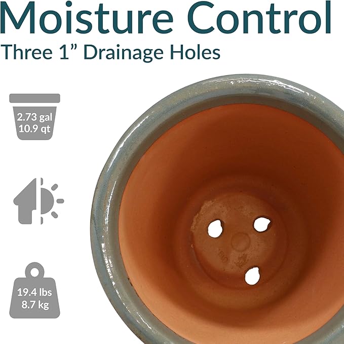 • LARGE SIZE FOR GROWING PLANTS: The large plant pot features a spacious top diameter and 2.73-gallon soil capacity that provides ample space for plants to grow. The planter has a 15" outer top diameter (12.75" inner diameter) x 8.5" outer base diameter (6" inner base diameter) x 12.5" H outer (11.5" H inner) and weighs 19.4 lbs.