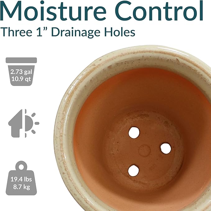 • LARGE SIZE FOR GROWING PLANTS: The large plant pot features a spacious top diameter and 2.73-gallon soil capacity that provides ample space for plants to grow. The planter has a 15" outer top diameter (12.75" inner diameter) x 8.5" outer base diameter (6" inner base diameter) x 12.5" H outer (11.5" H inner) and weighs 19.4 lbs.
