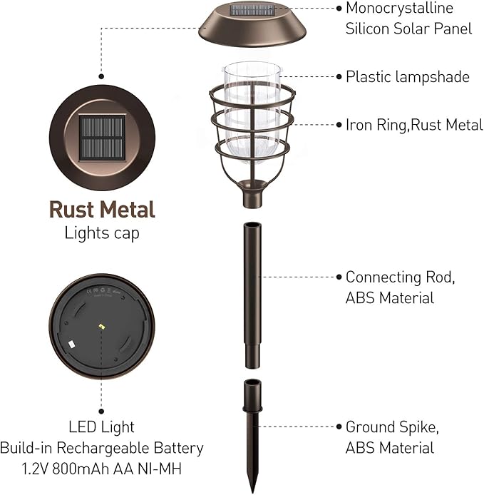 • ☼ RUSTPROOF METAL & DURABLE. The updated solar pathway lights are strong enough to stay outside for a long time. Special designed metal light cap and metal ring which are much better than the plastic made cheaper products.