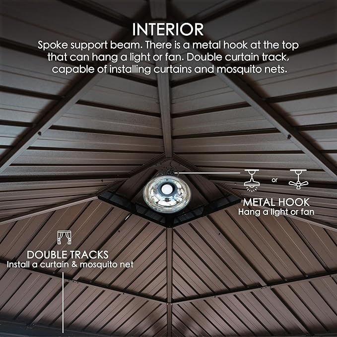 • ✅Two hooks have been specially crafted to accommodate fans or lights, enhancing the ambiance of your gazebo and making it a comfortable and inviting space.