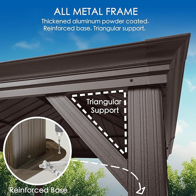 • ✅Strong Structure Hardtop Gazebo - This gazebo features 4.7” x 4.7” triangular poles and 5” x 4” beams, providing a solid foundation, ensuring both stability and longevity. Complemented by a galvanized steel roof and a sturdy frame, the gazebo offers unparalleled support. It is capable of withstanding snow loads of up to 2500 lbs and wind speeds of up to 40 MPH.