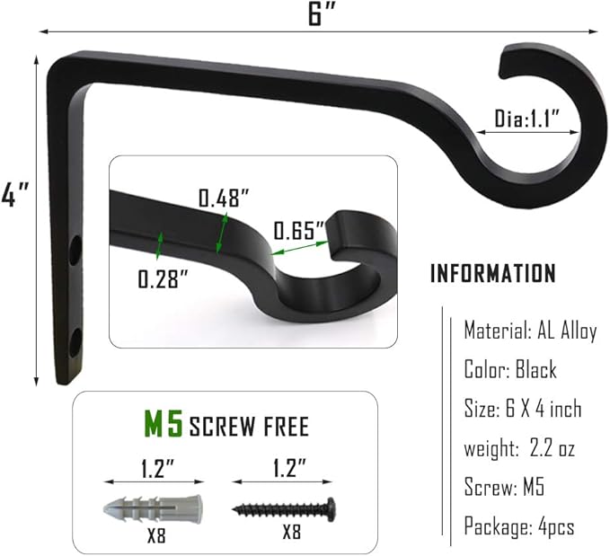 • 【EASY TO INSTALL】This package includes 2 plant hooks, 4 screws and 4 wall anchors, and maximum load up to 22 lb. Each screw is a standard M5 screw, 1.2 inches long. All you have to do is screw the screws into the wooden fence posts, deck posts and even the interior walls. It looks great in a variety of different environments.