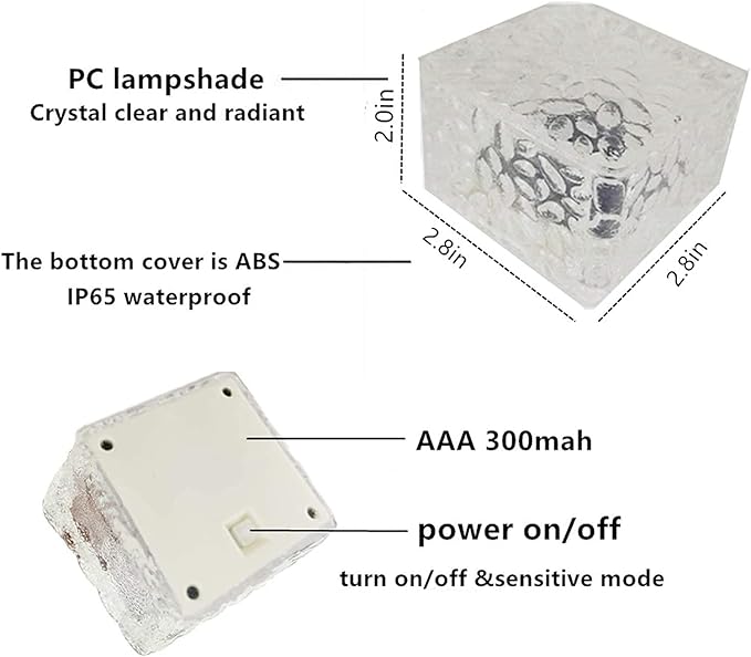 • Easy to use Solar Brick Light: Our Solar Ice Cube Lights Outdoor Waterproof are easy to install without wiring, and the automatic light sensor will automatically turn them on and off. Please remember to turn on the switch to "ON" after receiving this LED landscape light to make sure it is It can be charged under the sun and light up your yard when night falls