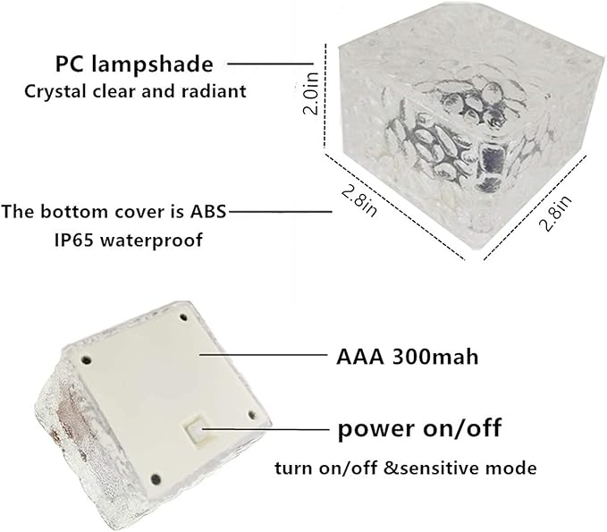 • Easy to use Solar Brick Light: Our Solar Ice Cube Lights Outdoor Waterproof are easy to install without wiring, and the automatic light sensor will automatically turn them on and off. Please remember to turn on the switch to "ON" after receiving this LED landscape light to make sure it is It can be charged under the sun and light up your yard when night falls