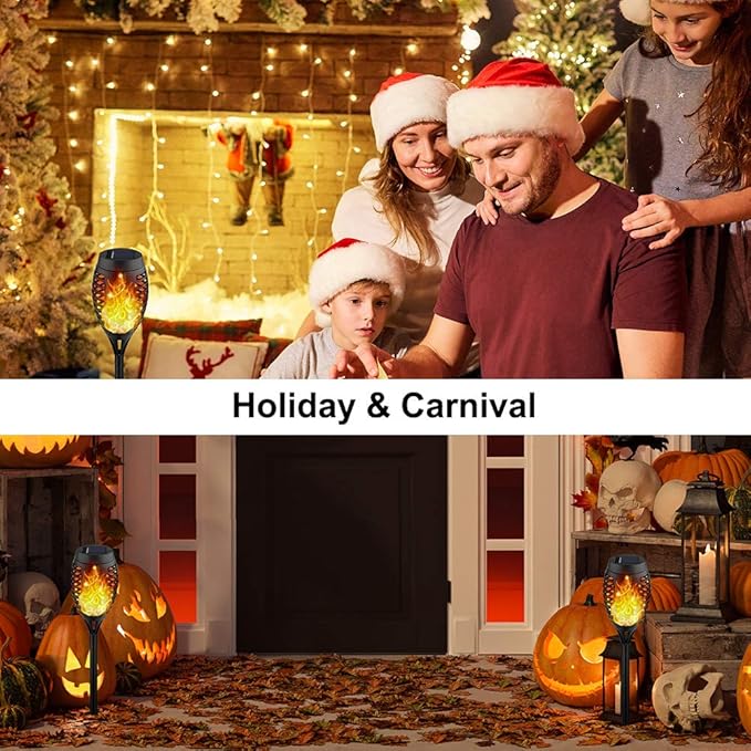 • Torch Lights Flickering Flame: Solar outdoor lights flicker a soft and mod-enhancing "Real" flame for outdoor decorations for patio, garden, yard, porch, pool decor and for party, camping, barbecue, wedding, christmas, halloween decor.