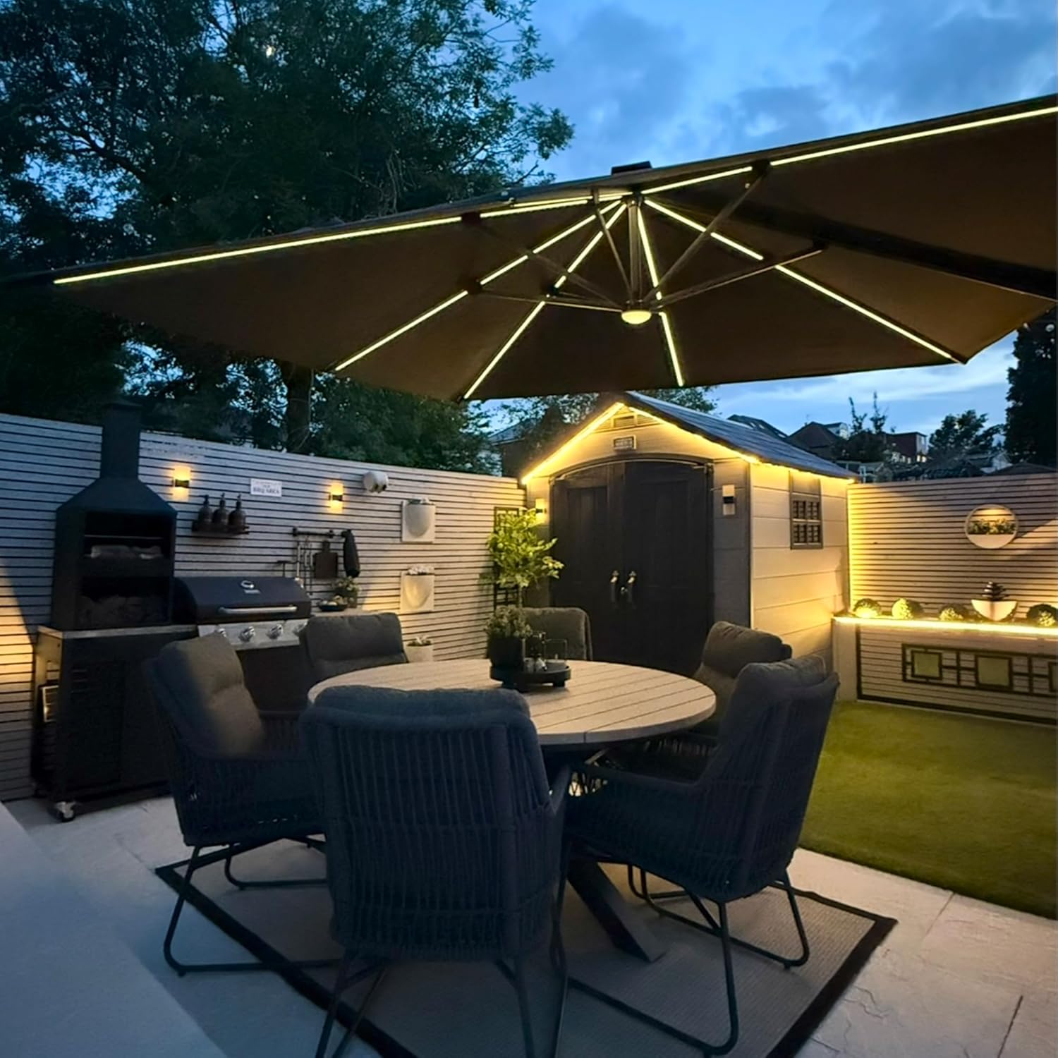 • Powder coated all-aluminum umbrella bones and 8 heavy-duty ribs and comes with led lights that is powered by a solar panel on top, design for durability and enjoyment for outdoor use