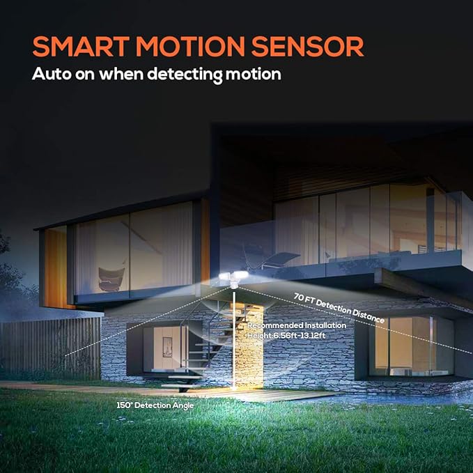• 【IP65 WATERPROOF & DURABLE】IP65 waterproof rating ensures that your motion-activated flood light won’t give in in rain, sleet, or snow weather. It's specifically designed to withstand extreme weather conditions, all-weather resistant and provides additional safety and security for your home. More durable aluminum design provide the product a good heat dissipation function, the outstanding lifespan of 50,000 hours can effectively reduce the frequency of replacing fixtures.
