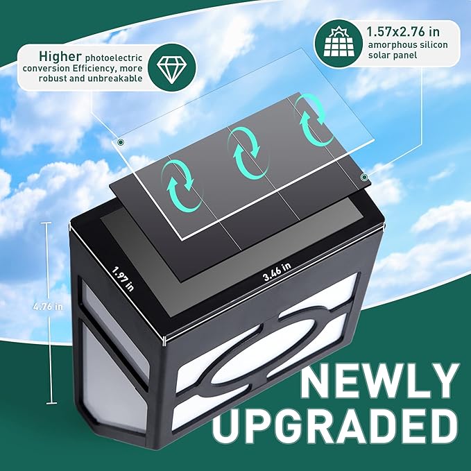 • 【SOLAR DECK LIGHTS】During the day, solar panels absorb energy from the sun and convert it into electrical energy, which is released at night. With just 6-8 hours of sunlight, can provide 8-10 hours of lighting at night, meet your outdoor lighting needs