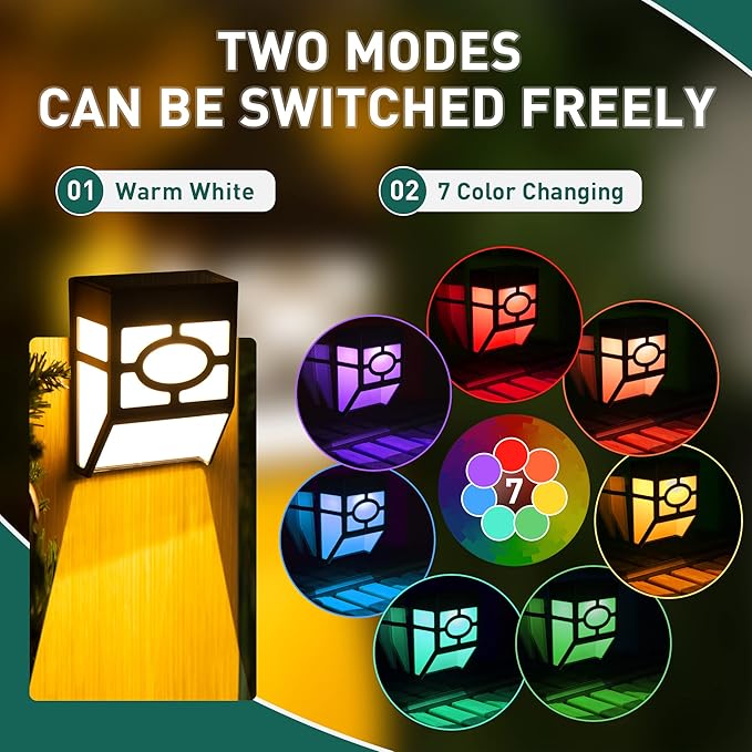 • 【2 MODES】Solar fence lights come with 2 modes: warm white and color-changing RGB. The warm white mode is great for everyday lighting and decoration, while the RGB mode has 7 colors that fade in and out, making it perfect for Halloween and Christmas